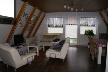 Im Erdgeschoss ist ein großzügiger Wohn-/ Essbereich mit Kamin, SAT-TV und Stereoanlage. Das Duschbad hat eine Waschmaschine. Die Küche ist mit Geschirrspüler, Cerankochfeld, Kühlschrank, Mikrowelle mit Heißluft, Grill und Automatikprogrammen, Kaffeemaschine, Toaster, Wasserkocher bestückt.