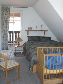Schlafzimmer mit Doppelbetten, ein Kinderbett vorhanden