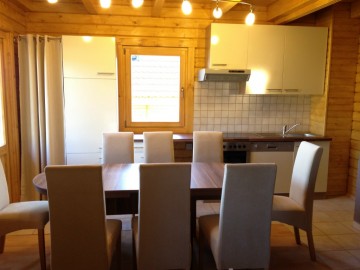 Die vollausgestattete Küchenzeile mit Essgelegenheit für 8 Personen befindet sich ebenfalls im Erdgeschoss mit Blick auf den Kamin.