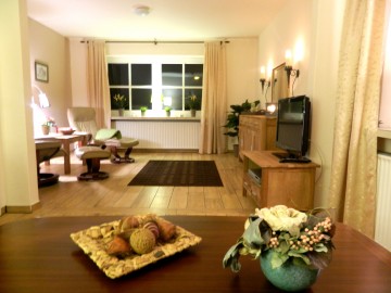 Die liebevoll 2012 neu renovierte, ebenerdige 84qm große Doppelhaushälfte hat ein großes Wohnzimmer mit Sitzgruppe und gemütlicher Relaxecke, LCD- Fernseher, Musikanlage und DVD-Player. Das gesamte Haus ist gefließt und in den Wohnräumen in Holzoptik.