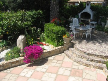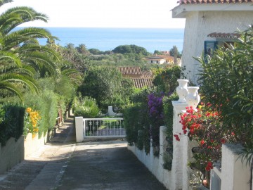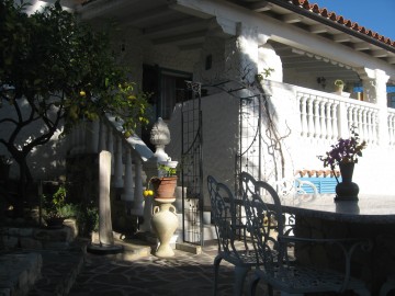 Anderhalbgeschossig bietet die Ferien-Villa einen traumhaften Blick aufs Meer und Berge von der 40qm grossen ueberdachten mobelierten Veranda,hier haben auch 10 Personen bequem Platz.Die separate Wohnkueche Wohnzimmer Schlafzimmer haben auch Meerblick Kueche und Wohnzimmer gehen zur Terrasse raus von da aus in den Garten.Das separate Appartement hat auch einen Kuehlschrank und TV Sat-die Villa bietet 2 Baeder 3 Toiletten Aussendusche mit Warmwasseranschluss-geschlossenes privates