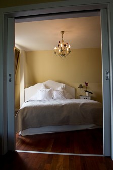 Das separate Schlafzimmer hat ein Doppelbett und ist durch eine Schiebetür vom Wohnraum abgetrennt.