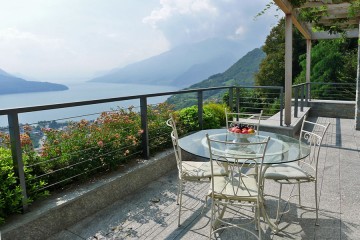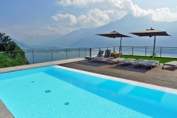 Im Ort Vercana, nur 5 Minuten von Domaso am Westufer des Comer Sees, entfernt, entstand 2010 dieses beeindruckende Gebäude. Zwei der Wohnungen dort können gemietet werden. Allen Bewohnern steht der großzügige Poolbereich auf den Dach des Gebäudes zur Verfügung. Hier oben kann man auf einem der Liegestühle entspannen, den umwerfenden Blick genießen und im großen Pool (ca. 15x5m) baden. Die Gartenanlage wurde geschickt so bepflanzt, das ganzjährig immer etwas Schönes blüht. Besonders stolz ist man auf einige Kamelien, die ab November in Blüte stehen.