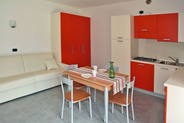 Einraumappartment mit 1 Doppelschlafcouch sowie 1 Etagenbett. Küchenzeile mit Geschirrspüler, Eßtisch, SAT-TV, Bad mit Dusche, Balkon oder Terrasse mit Tisch und Stühlen. Dazu gehört ein Garagenstellplatz.