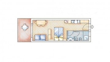 1-Zimmerappartement 28 m2, Außenloggia 6 m2 mit Tisch und Stühlen, Wohnraum mit Kochecke und Kühlschrank, Bad mit Duschkabine, Toilette, Bidet und Haartrockner, LCD Fernseher, Safe und Telefon.Sehr komfortabel und geschmackvoll eingerichtet, mit Blick aufs Meer.
