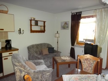 Unsere liebevoll eingerichtete, nach unseren Pferden benannte Ferienwohnung Romano, befindet sich im zweiten Stock mit Balkon und Blick zum Wald und Reitplatz.