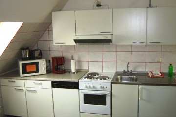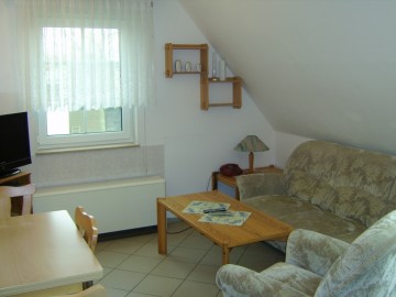 Im komfortablen Haus - Baujahr 1997/98 - befinden sich 4 Ferienwohnungen mit moderner und solider Ausstattung. Sie sind jeweils ca. 35 (30) m² groß. Jede Wohnung verfügt über ein separates Schlafzimmer, Bad mit WC und Dusche bzw. Badewanne. Alle Wohnungen haben, Sat-TV, Telefon, W-Lan-Empfang und Nachtspeicherheizung. Sie haben im Wohn- und Küchenbereich eine Kochnische bzw. Pantryküche, mit Spüle, Kühlschrank mit Gefrierfach, Spülmaschine, Kaffeemaschine, Wasserkocher, Mikrowelle und Toaster. Sie sind komplett eingerichtet mit Geschirr, Töpfen und Besteck. In den Erdgeschosswohnungen rot und orange, findet die Aufbettung auf der Schlafcouch (Liegefläche ca. 1,40 x 1,90 m) statt. In diesen FeWos finden Sie Terrassen mit Gartenmöbeln, Sonnenliegen und Sonnenschirm, sowie Kompakt–Stereoanlage mit DVD/CD-Player. Die FeWo orange ist behindertenfreundlich eingerichtet: Die Türen sind 90 cm breit, die Dusche ebenerdig mit Duschhocker und Haltegriffen. Der Waschtisch ist unterfahrbar, die Betten lassen sich auch separat stellen. Zum Haupteingang und zur Terrasse führen Rampen. Die Obergeschosswohnungen grün und blau bieten für den Nachwuchs ab ca. 6 Jahren eine besondere Attraktion. Hier findet die Aufbettung auf einem kleinen Schlafboden statt.