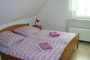 Jede Ferienwohnung verfügt über ein Schlafzimmer mit einem Doppelbett. Es gibt jeweils 2 Aufbettungsmöglichleiten. In den unteren Wohnungen auf der Schlafcouch. In den oberen Wohnungen befindet sich ein Schlafboden, der 2 Kindern einen Schalfplatz bietet.