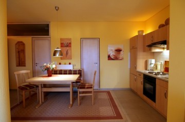 Das Appartement ist aufgeteilt in Schlafbereich, Wohnbereich, Küche und einem kleinen Raum mit 1 x 2 m Bett. Das Appartement hat eine Terrasse mit Gartenmöbeln. Vor dem Haus befindet sich ein PKW Stellplatz. Ein abgeschlossener Raum für Fahrräder ist vorhanden.