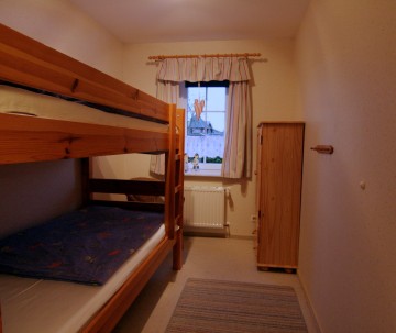Die Ferienwohnung verfügt über ein Schlafzimmer mit Doppelbett, Kinderzimmer mit Etagenbett, großer Küche mit Geschirrspüler, Kühlschrank mit Gefrierfach, Mikrowelle, Wasserkocher und Toaster.