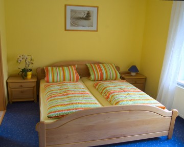 Das Schlafzimmer bietet ein Doppelbett (180 x 200 cm) sowie einen Spiegelschrank. Bei Bedarf ist ein Kinderreisebett zustellbar.