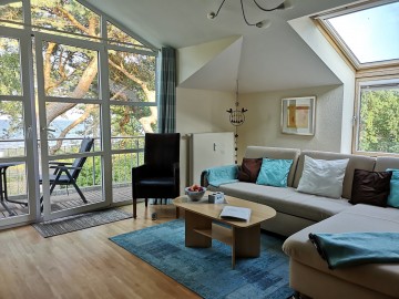 Die helle Nichtraucher-Wohnung bietet Platz für 2 Personen und befindet sich im Obergeschoss der Dünenresidenz Juliusruh, einem ruhigen Haus direkt an der Ostsee, das über einen privaten Zugang zum ca. 11 km langen feinen Sandstrand der Schaabe im Norden Rügens verfügt.