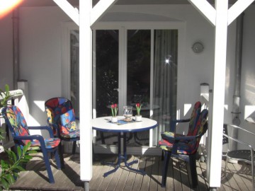 Vom Wohnzimmer gelangen Sie auf die überdachte, nur Ihnen zur Verfügung stehende Terrasse. Bequeme Stühle, Auflagen und ein Tisch stehen selbstverständlich bereit. Durch die Bäderstilarchitektur sitzen Sie auch bei Regen trocken im Grünen. Von hier genießen Sie den Blick in den Garten mit Teich, Springbrunnen und viel Grün bis zum Stadtwald.