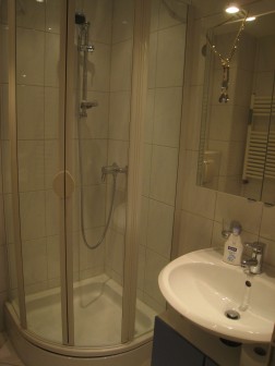 Das neu renivierte Bad bietet indirekte Deckenbeleuchtung, Dusche, WC, Waschbecken.