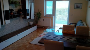 Die 2-Zimmer-Wohnung bietet Schlafgelegenheiten für max. 4 Personen. 1 Schlafzimmer mit Doppelbett und ein Wohn-Ess-Zimmer mit Schlafsofa.