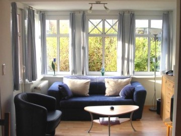 Die komfortabel ausgestattete Ferienwohnung ist mit Laminat ausgelegt. Grosse Fenster lassen viel Licht in die freundlich mit hellen Möbeln aus Buchen- oder Kiefernholz ausgestattete Wohnung.