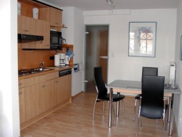 Ein separates, großzügiges Schlafzimmer mit Doppelbett (2,00 x 1,80 m), in welchem auch ein Kinderbett noch Platz hat, eine Küchenzeile mit komfortablem Eßplatz und eine gemütliche Sitzecke im hellen Erker des Wohnzimmers stehen Ihnen zur Verfügung.