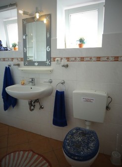Das Badezimmer ist ausgestattet mit einem Waschbecken, WC, Dusche und Haartrockner. Die Erstausstattung Handtücher ist bei uns inklusive.