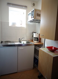 Die Pantry-Küche ist ausgestattet mit einem Kühlschrank mit kleinem Gefrierfach und einem Kochfeld mit 2 Herdplatten. Ein Wasserkocher, eine Kaffeemaschine, ein Eierkocher, ein Toaster und eine Mikrowelle mit Doppelgrill, Backfunktion und Heißluft ist auch noch vorhanden. Geschirr, Gläser, Töpfe und vieles mehr.