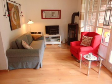 Wohnbereich: Moderne Schlafcouch für 2 Personen,W-Lan + Telefon, TV-Sat Anlage + DVD-Player, Musikanlage, Sessel, Couchtisch, Kaminofen,