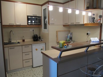 Die Wohnung selbst ist Frisch renoviert und hat ein Badezimmer und ein durchgehendes großes Zimmer mit Küche. In diesem Zimmer befindet sich ein sehr komfortables Schlafsofa, welches leicht in ein Doppel- oder zwei Einzelbetten umgebaut werden kann. Die Küche ist sehr gut ausgestattet mit allen notwendigen Elektrogeräten (es gibt kein Gas).