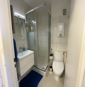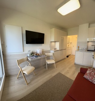 Sie finden eine moderne, neu eingerichtete 1 - Zimmer Ferienwohnung mit Flur, Duschbad, Wohn-/Schlafraum mit kompletter Einbauküche und Loggia Balkon vor.