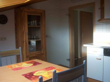 Die Ferienwohnung bietet eine voll ausgestattete Küche mit Backofen, 4 Plattenherd, Kühlschrank mit Gefrierfach, Kaffeemaschine, Wasserkocher, Mikrowelle, Toaster, Besteck,Geschirr und Gläser. Eßbereich ist in der Küche integriert - bestehend aus 1 Eßtisch mit 4 Stühlen, 1 Schrank ( für Gläser/Geschirr)
