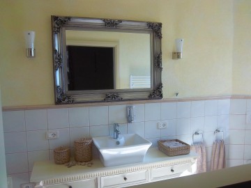 Der Palazzo-Medici verfügt über ca. 80 cm dicke Außenmauern aus Naturstein. Auch die Innenwände sind größtenteils aus Naturstein. Dies verschafft in den Wohnungen ein sehr angenehmes Raumklima, gerade im Bezug auf die im Süden hohen Außentemperaturen. Zusätzlich sind alle Aussenwände thermisch isoliert, sowie deutsche Fenster mit einem k-wert von kleiner 1 zur maximalen Wärmedämmung eingebaut. Die 3-Zimmer-Wohnung besteht aus einem ca 25m² großem Wohn- und Esszimmer mit großem Südbalkon (ca. 11m²) und unverbaubarem Blick in die grünen Hügel der Toscana. Die Wohnung verfügt über 2 Schlafzimmer mit jeweils eigenem Bad und einem weiteren Balkon zur Dorfseite hin. Das 2. Schlafzimmer kann auch für Gäste - mit separatem Eingang - genutzt werden. Sowohl Telefon-(ADSL-Anschluss) ist verfügbar und Satellitenantennenanschluss für deutsches TV ist vorhanden. Dank der hervorragenden Wärme-Isolierung nach deutschen Normen( mit Energiezertifikat) lässt sich die Wohnung mit einem Kaminofen oder Pelletofen (Kaminvorinstallation vorhanden ) selbst im Winter komfortabel beheizen. Verwertet wurden nur hochwertige, toskana-typische Materialien, die höchste Anforderungen an modernen Wohnkomfort erfüllen und den einzigartigen Flair dieses toskanischen Palazzo´s unterstreichen. Alle Decken sind in der typisch toskanischen Bauweise erstellt worden. Also mit sichtbaren, tragenden Holzbalken aus Edelkastanienholz, den schmäleren „correnti“ ebenfalls aus Vollholz und „mezzane„ aus Terracotta. Im Schlafzimmer sind hochwertige Vollholzdielen aus Eiche verlegt. Die Bauqualität und die Bauausführung sind nach deutschem Standard als sehr hochwertig zu bezeichnen, die Ausstattung ist nobel. Hier wurden edle landestypische Materialien verwendet wie alte Terracottafliesen und Dielen aus Eiche. Die Badarmaturen, Waschtisch und Toilette entsprechen einem hohen Neubaustandard.