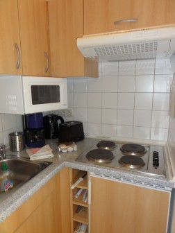 Die kleine Mini-Pantryküche ist komplett ausgestattet: Kühlschrank mit Gefrierfach, Mikrowelle, Kaffeemaschine, Wasserkocher und Toaster.
