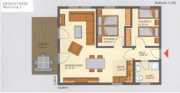 Die Wohnung haben ein großes Wohnzimmer mit gemütlicher Sitzecke, Kamiofen und SAT-HD-TV. Die offene Küche mit Eßtisch schließt sich an das Wohnzimmer an. Die Küche hat alles was man zum Urlaub braucht vom Wasserkocher über eine 4-Plattenherd mit Backofen bis hin zum Geschirrspüler. Es gibt zwei Schlafzimmer (1 * Doppelbett und einmal 2 Einzelbetten) und ein Bad mit Dusche.