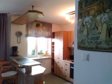 Küche : Kühlschrank, Glaskeramikofen , Mikrowelle, Spülmaschine, Kaffeemaschine, Toaster, Elektrokocher, Geschirr, Besteck, Geschirrtücher