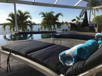 Auf der riesigen, durch einen Screen / Fliegengitter (wie in Florida üblich) geschützter Terrasse befindet sich ein großer „Endless“ Pool. Dieser ist mit einem Wasserüberlauf in Richtung See ausgestattet, dies wirkt, als sei der Pool mit dem See eins. Hier können Sie die schönsten Sonnenuntergänge erleben - jeden Abend unterschiedlich und beeindruckend. Ebenfalls gibt es einen Spa (Whirlpool) und eine Sonnenliegefläche im Wasser.