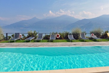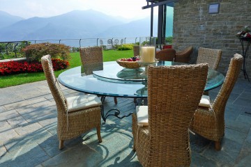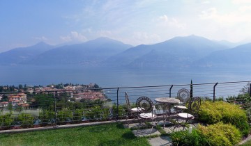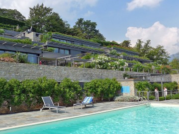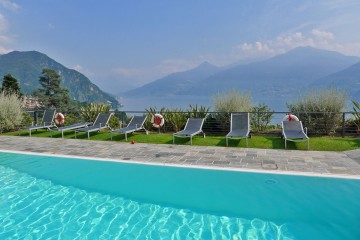 Im eleganten Stadteil Sant'Andrea di Menaggio hat ein renomierter Architekt zusammen mit einem bekannten Landschaftsarchtitekten dieses exklusive Refugium geschaffen. Eine der Luxuswohnungen kann man mieten und dort unvergessliche Ferien verleben. Die Wohnung befindet sich in der ersten Etage. Sie bietet drei Schlafzimmer, zwei luxuriöse Bäder und einen großen Wohnraum mit angegliederter Designerküche. Die Einrichtung ist sehr elegant und stammt von einem toskanischen Möbelhaus. Alles passt wunderbar zusammen und wird von edlen Dekorationsobjekten, Originalbildern und exklusiven, neapolitanischen Lampen ergänzt. Ein ganz besonderes Ambiete! Vom Wohnraum und zwei der Schlafzimmer haben die Gäste Zugang zum großen Garten mit 2 Terrassen und beeindruckendem Blick. Der Comer See liegt Ihnen zu Füßen, bei Tag und auch in der Dunkelheit ein besonderes Erlebnis. Die Terrassen sind möbliert, den Gästen steht ein Gasgrill zur Verfügung. Zum Haus gehört der parkähnlich angelegte Garten und ein großer Gemeinschaftspool. Bei einer Größe von 25x8m kann man dort richtig schwimmen. Rund um den Pool stehen Liegestühle, Sonnenschirme und Duschen zur Verfügung. Zur Wohnung gehört ein Garagenstellplatz.