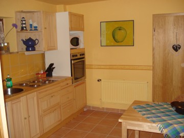 Die 45m² Nichtraucher-Ferienwohnung befindet sich im Erdgeschoss und teilt sich in ein Schlaf-/Wohnbereich, einer voll eingerichteter Küche, sowie ein Duschbad auf.