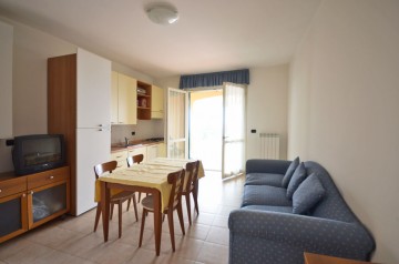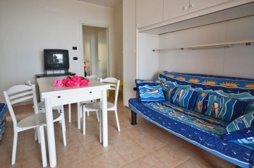 Zweizimmerwohnung im EG mit 1 Schlafzimmer (Doppelbett sowie 1 Einzelbett), Badezimmer mit Dusche und einem Wohnraum mit integrierter Küchenzeile. Im Wohnraum befinden sich ein Schlafsofa sowie ein großer Esstisch und der Zugang zur großen Terrasse mit herrlichem Meerblick. Zur Wohnung gehört ein mediterran bepflanzter Garten, es kann auch gegrillt werden.