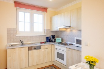 Neben zwei Einzelbetten im Schlafzimmer steht im kombinierten Wohn-/Essraum ein aufbettbares Bettsofa (180 x 200 cm - Kingsize-Doppelbett) mit Relax Rückenlift und Bed Box Ablage zur Verfügung, so dass die Wohnung bis zu vier Personen Platz bietet. Zur Wohnung gehören eine Essecke sowie eine vollständig ausgestattete Kochecke (mit E-Herd, Kühlschrank mit Gefrierfach, Geschirrspüler, Mikrowelle, Kaffeemaschine, Wasserkocher, Toaster etc.). Ein Bad mit Dusche und WC, ein zusätzliches Gäste-WC, Sat-TV und Musikanlage im Wohnraum und ein Abstellraum u. a. mit Wäscheständer und Terrassen-Möbeln für eine schöne eigene gut geschützte nach SüdWest liegende Sonnenterrasse runden diese Komfort Ferienwohnung ab. Bis zum Sonnenuntergang verwöhnt Sie die Terrasse mit einem angenehmen Klima.